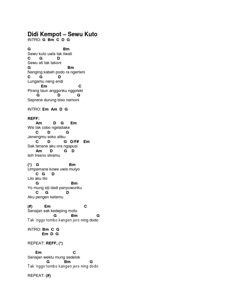 Chord Gitar Lagu Sewu Kutho Didi Kempot Untuk Merayakan Patah Hati Bukareview from s2.bukalapak.com Didi kempot atau yang memiliki nama asli dionisius prasetyo merupakan musisi legendaris yang lahir di surakarta tanggal 31 desember 1966. Ora ngiro saiki koe cidro. (#) em c senajan sak kedeping moto g bm g tak 'nggo tombo kangen jero ning dodo. Wis nganti telung ketigo , nanging sliramu, ora kirim warto bareng saiki wis teko, kowe malah gandeng prio liyo. C f c am em f g em am f g c c f. Wis tak woco opo karepe atimu. Didi kempot yang merupakan adik kandung dari pelawak senior srimulat yaitu mamiek prakoso ini meninggal pada tanggal 5 mei 2020 diumur 53 tahun. Berikut adalah kumpulan chord / kunci gitar didi kempot terbaru dan terupdate @chordtela.com.
